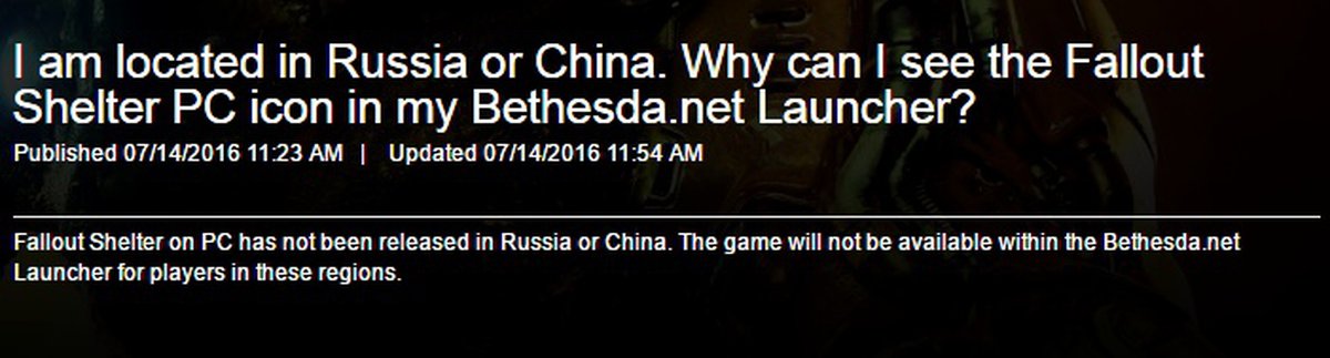 Информация о том, что PC-версия Fallout Shelter будет недоступна для игроков, проживающих в России и Китае, размещена в разделе помощи на официальном сайте Bethesda.