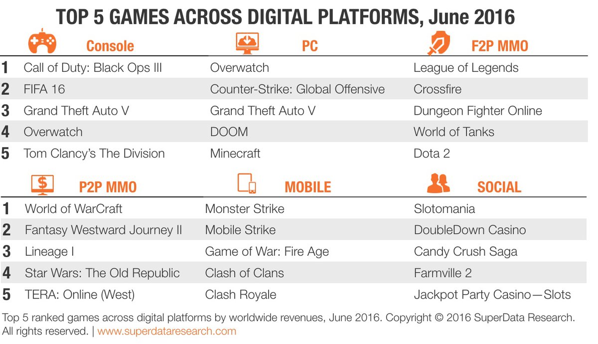 Аналитическая компания SuperData Research опубликовала результаты июньского исследования игрового рынка. Согласно данным SuperData, в июне самой популярной консольной игрой стала Call of Duty: Black Ops 3, а на PC игроки предпочитали Overwatch.