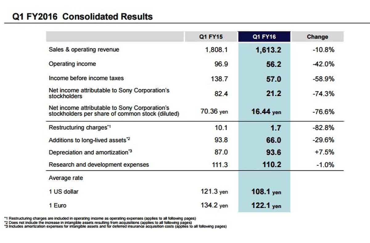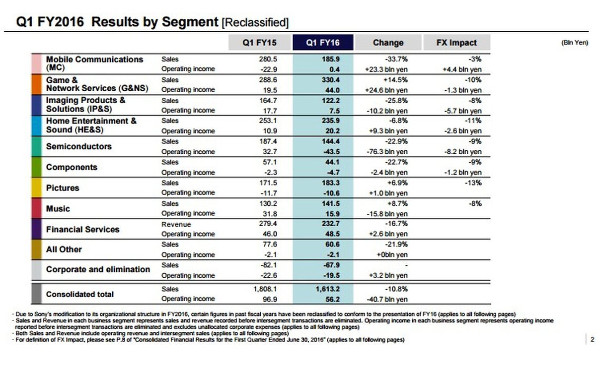 По сравнению с тем же кварталом 2015 финансового года продажи Sony снизились на 10.8%, операционная прибыль упала на 42%, а прибыль до налогообложения - сразу на 58.9%. При этом у игрового подразделения Sony все неплохо, оно показало рост на 14.5%. Значительно ухудшились результаты мобильного и полупроводникового направлений, а также некоторых других подразделений компании.