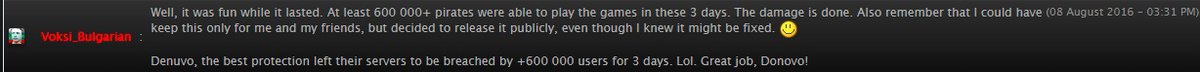 Настал понедельник, сотрудники Valve и Denuvo Software Solutions GmbH вышли на работу, изучили появившийся на выходных способ обхода, созданный хакером Voksi, и успешно устранили уязвимость - обнаруженный хакером способ активации больше не работает.