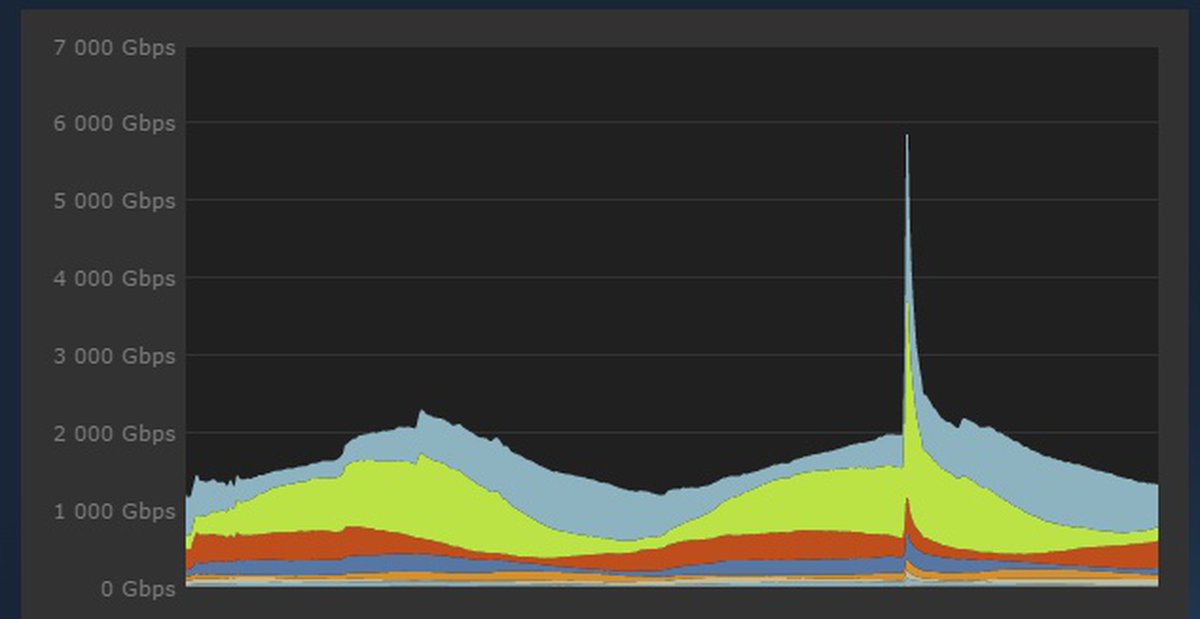 А вот так, например, выглядел выход игры с точки зрения серверов Valve - сотни тысяч игроков бросились качать клиент No Man’s Sky, хорошо еще, что весил он совсем немного. Почти 6 терабит трафика в секунду, где вы еще такое увидите.