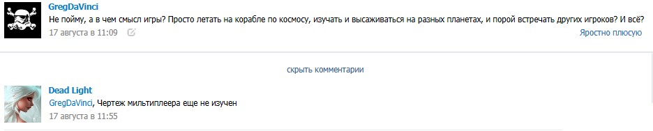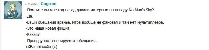 Скудные претензии не могут помешать хорошей игре. Ну не было в команде всех представителей человечества, и что? Большей проблемой является то, когда имеется команда, но она не может оправдать ожиданий. Я уже не говорю об обещаниях, так как их в основном дают в период анонса. Речь идет о функциях, которые рекламировали до последнего, а в конце выяснилось, что нам подсовывали желаемое за действительное. Как вам оправдание: «У нас есть мультиплеер, но карта настолько велика, что вероятность встретить другого игрока равна нулю». Смешно? Особенно когда «каким-то чудом», «проведя точные расчеты», два игрока оказываются на одной планете, но ... она не синхронизируется. Вуаля. Либо это революционный подход, либо Gogrum частично прав.