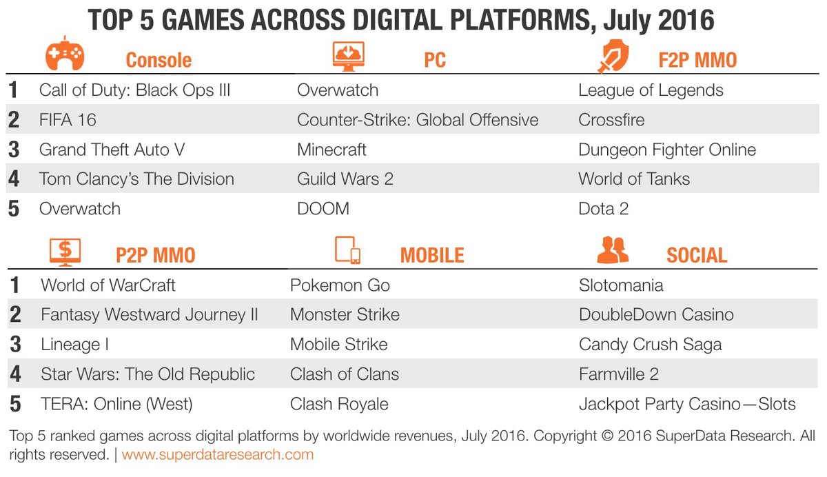 Аналитическая компания SuperData Research опубликовала июльский отчет по положению дел на мировом рынке игры. Лидеры практически не изменились: согласно данным SuperData, на PC самой прибыльной игрой остается Overwatch, на консолях - Call of Duty: Black Ops 3.