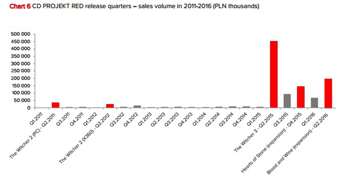 В первой половине 2016 года основную выручку сгенерировало второе дополнение для Ведьмака, Кровь и Вино, сама игра все еще продается очень неплохо.