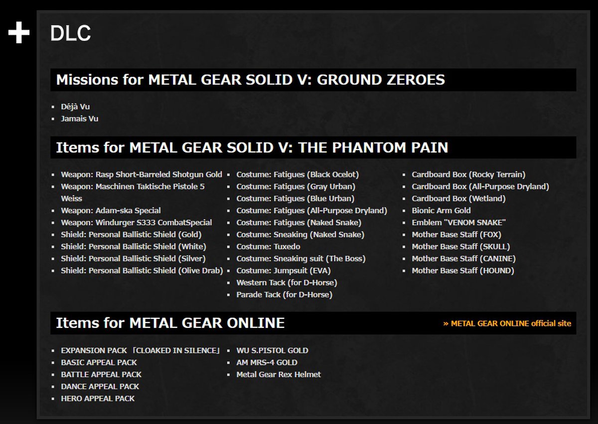 В состав издания войдут Metal Gear Solid 5: The Phantom Pain, Metal Gear Solid: Ground Zeroes и все дополнения как для Ground Zeroes (их всего два), так и для The Phantom Pain. Кроме того, покупатели The Definitive Experience получат специальные предметы для Metal Gear Online, онлайн-режима The Phantom Pain.