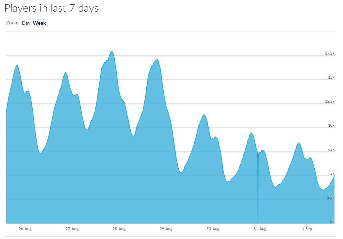 Вновь обратимся к данным steamdb. От былых 20 тысяч не осталось и следа - хорошо заметно, что за последнее время количество онлайн-игроков ни разу не добралось до этой цифры, еще неделю казавшейся очень и очень небольшой.