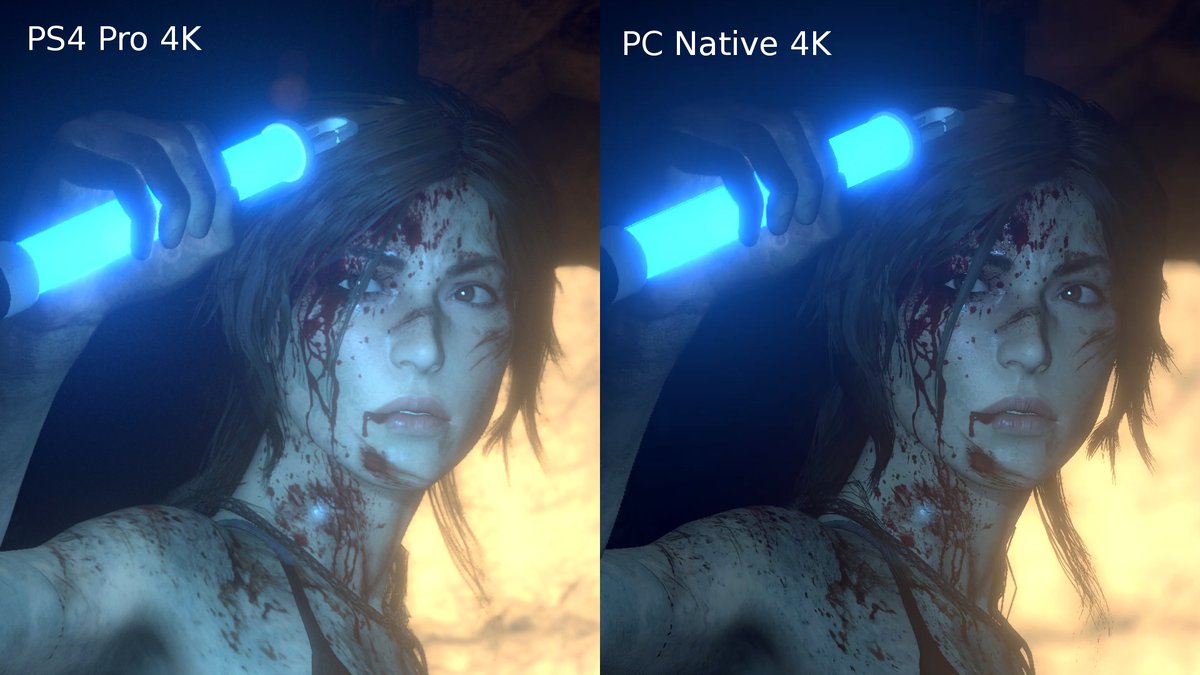 Действительно ли версия Rise of the Tomb Raider для PlayStation 4 Pro работает в разрешении 4К? Участники форума NeoGAF решили прояснить этот вопрос, сравнив опубликованный сегодня утром скриншот, сделанный на PS4 Pro, с изображением, снятом на PC при максимальных настройках графики.