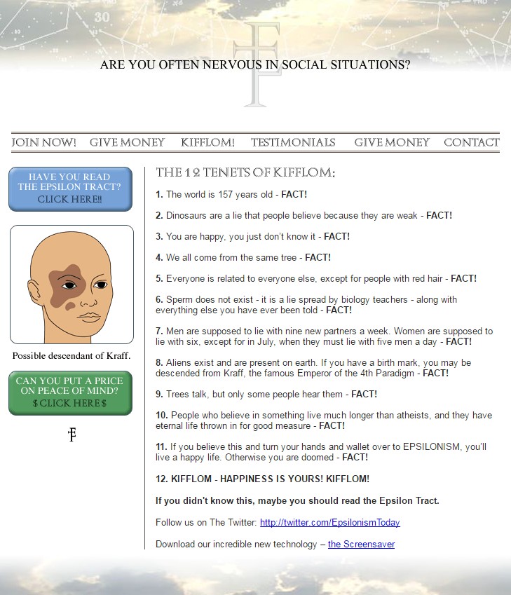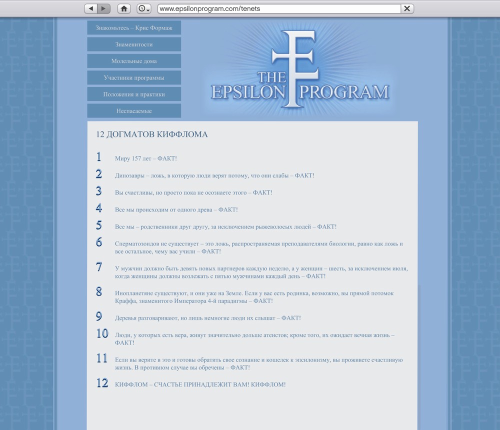 А вот здесь история уже совсем другая. Ещё до выхода самой GTA: SA, разработчики открыли сайт, посвящённый Культу - www.epsilonprogram.com. На нём содержались (и до сих пор содержатся, т.к. содержание сайта практически не изменилось) так называемые «12 фактов», являющиеся основными догматами Культа, а так же инструкция по вступлению в него. Тогда этот сайт никак не рекламировался и о нём практически никто не знал.