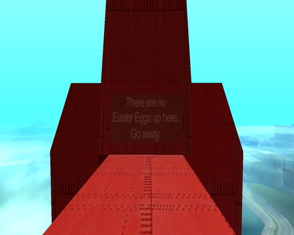 Итак, вернёмся на 12 лет назад. Вышла Grand Theft Auto: San Andreas, надолго запомнившаяся игрокам замечательным сюжетом, хорошей (для того времени) графикой и увлекательным геймплеем. Но в игре было и много того, что скрывалось от глаз различных геймеров. И речь в первую очередь о пасхалках. Одной из первых была найдена пасхалка на вершине моста, ведущего из Сан-Фиерро, где разработчики оставили небольшую табличку с надписью.