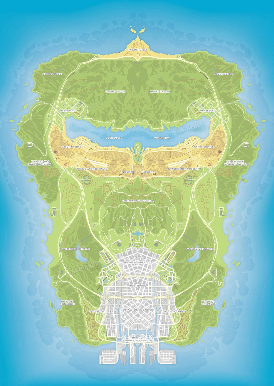Но и этим дело не ограничивается! Помимо самих тарелок, в GTA V присутствуют и гуманоиды. Одного из них можно найти ещё в самом начале игры, вмёрзшим в лёд. Других мы увидим, когда Майкл примет наркотик и нас похитят инопланетяне в его галлюцинациях. И есть ещё одна интересная вещь: если разделить карту GTA V пополам, после чего правую часть отразить и заменить ею левую, то мы сможем увидеть лицо пришельца.