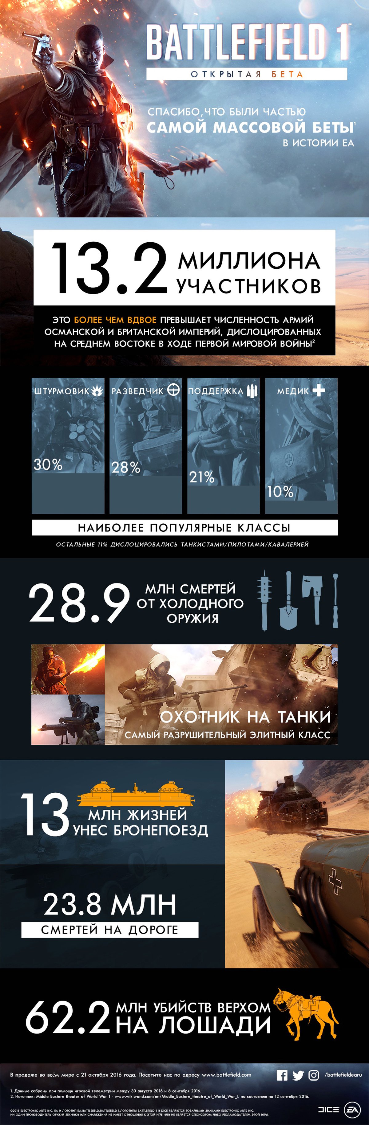 Спустя неделю после завершения открытого бета-тестирования Battlefield 1 EA и DICE решили поделиться некоторыми статистическими данными. Оказалось, что прошедший бета-тест был самым крупным в истории Electronic Arts - в нем приняли участие 13 миллионов 200 тысяч участников.