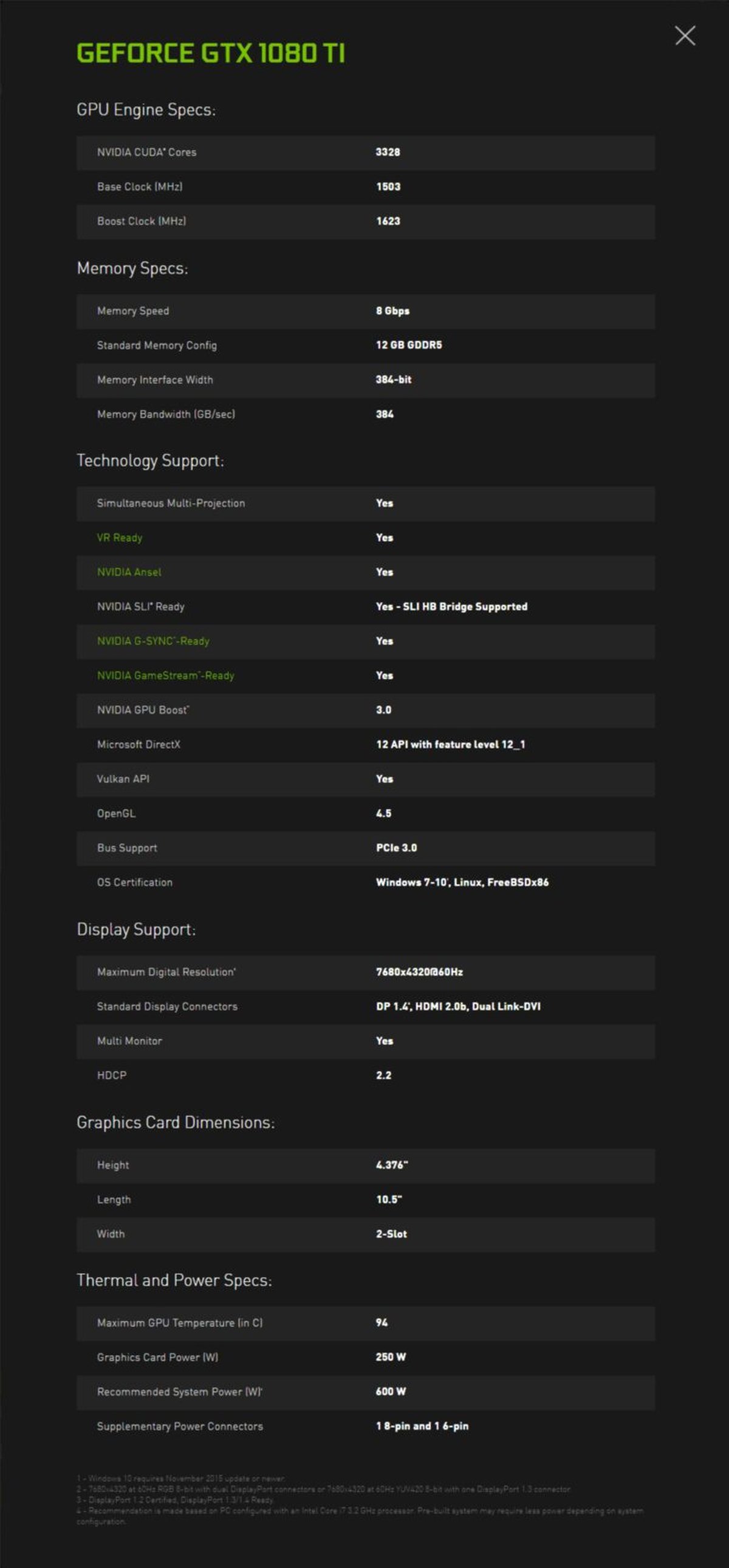 Nvidia GTX 1080 Ti якобы получит 3328 ядер CUDA, 12 гигабайт оперативной памяти GDDR5 (что странно, у GTX 1080 память стандарта GDDR5X) с пропускной способностью 384 Гб/сек. Производительность CPU GTX 1080 Ti может составить порядка 10.8 терафлопс, на 1.8 терафлопс больше, чем у GTX 1080.