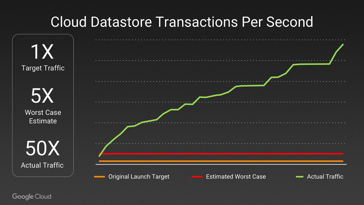На графике выше вы можете увидеть три кривых. Оранжевая - уровень нагрузки во время выхода игры, запланированный разработчиками. Красная - самый худший вариант, в 5 раз больше первоначальных предположений. И, наконец, зеленая - такую нагрузку Pokemon Go продемонстрировал на самом деле. Она оказалась в 50 раз больше, чем предполагали разработчики. На то, чтобы превзойти все оценки трафика, игре понадобилось всего 15 минут.