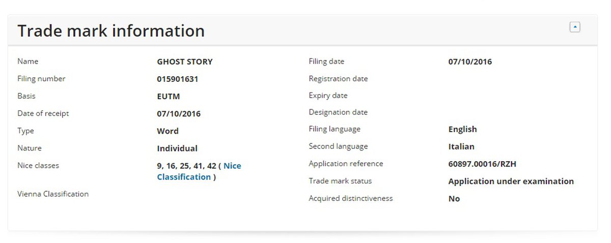 Торговая марка Ghost Story регистрируется по нескольким классам продуктов, в которые в том числе входят видеоигры, одежда, графика, видео, разнообразные печатные и мультимедийный материалы.