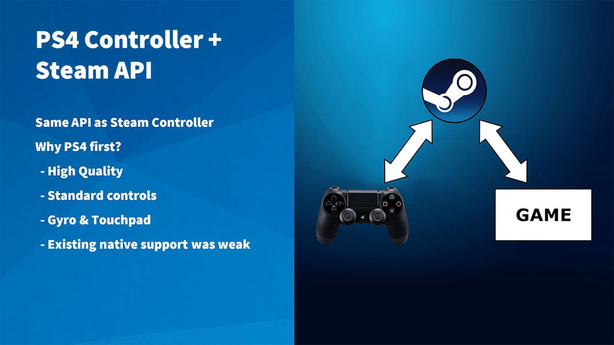 Хотите верьте, хотите нет, но во время подключения контроллера PlayStation 4 с помощью Steam API все работает точно так же, как у Steam Controller. Вы делаете те же самые вызовы API, а Steam API заботится обо всем остальном.