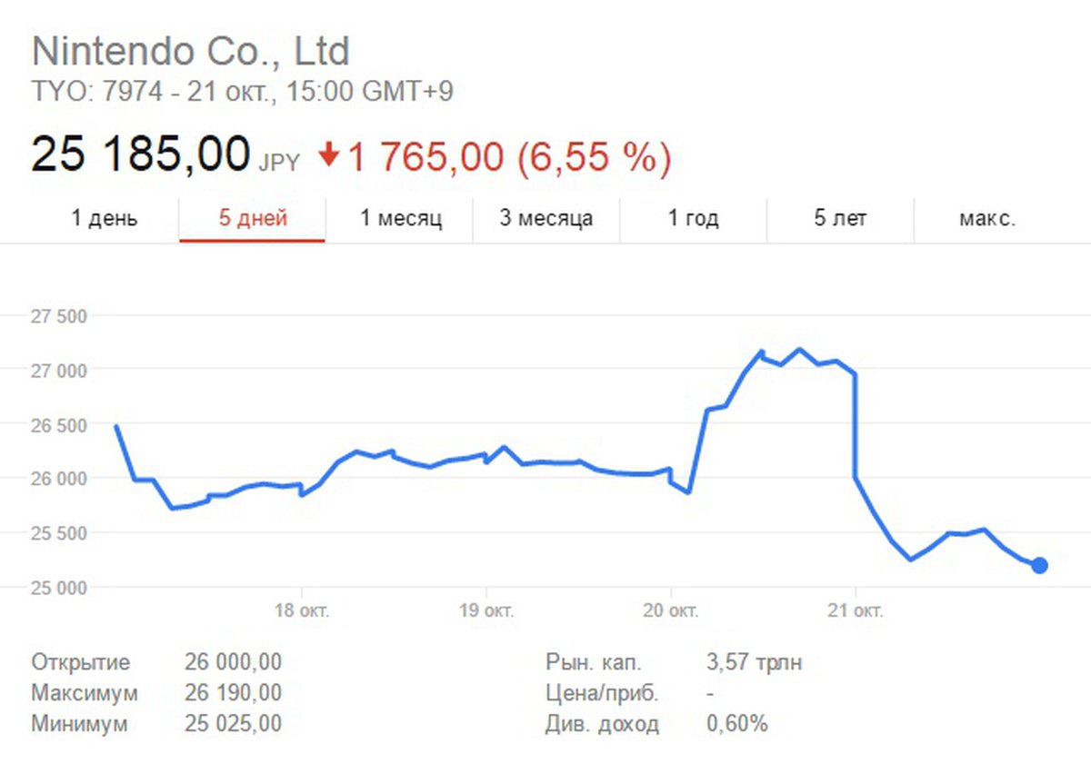 Вскоре после анонса устройства стоимость акций Nintendo пошла вниз. На данный момент падение составляет 6.5% - цена акции опустилась до минимальной отметки за последние полтора месяца.