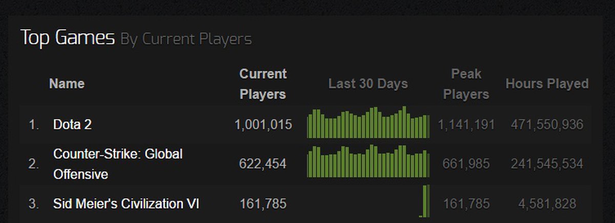 Прямо сейчас проект Firaxis Games занимает третье место по количеству активных игроков в Steam: новая Цивилизация следует сразу за Dota 2 и Counter-Strike: Global Offensive, с гигантским отрывом (161 тысяча против 77 тысяч) обходя опустившуюся на 4 место Team Fortress 2.