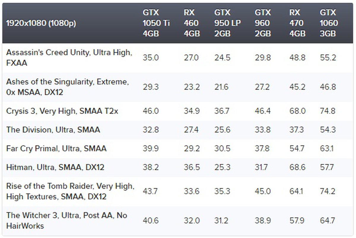 Взгляните на таблицу выше: в разрешении 1080p новая карта Nvidia уверенно обходит не только карты предыдущего поколения, но и AMD Radeon RX 460, причем до сегодняшнего дня видеокарта AMD была всего на $10 дешевле GTX 1050 Ti.
