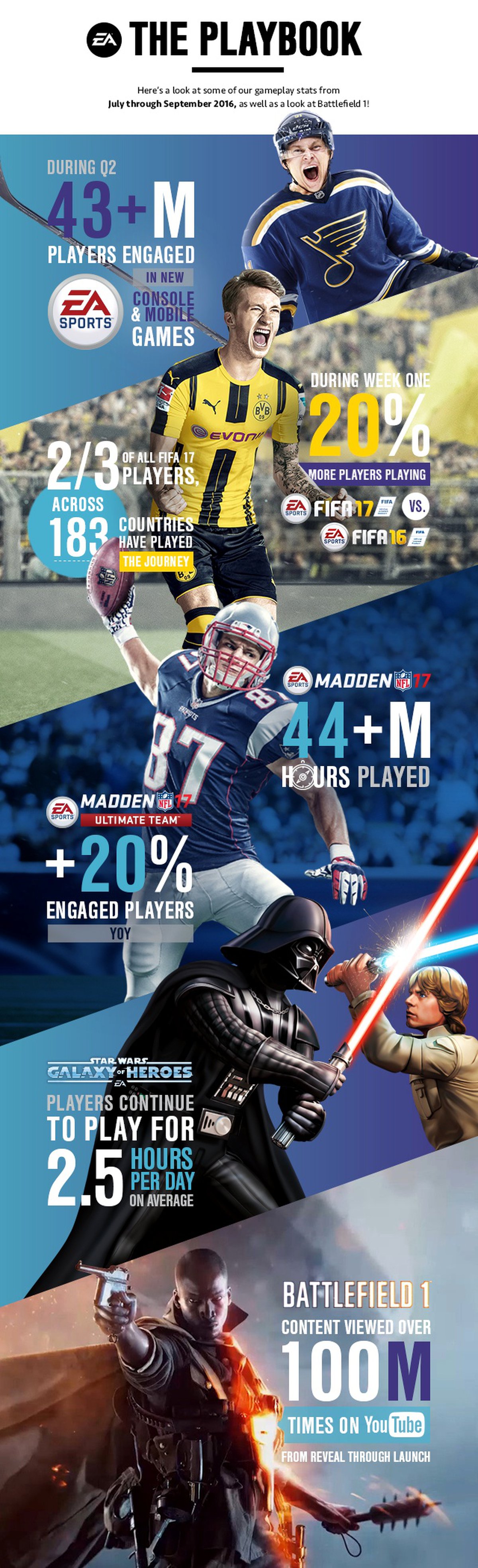 У FIFA 17 тоже все неплохо. В первую неделю игра привлекла на 20% больше игроков, чем предыдущая часть серии, причем 2/3 игроков попробовали себя в сюжетном режиме "История", впервые появившемся в FIFA.