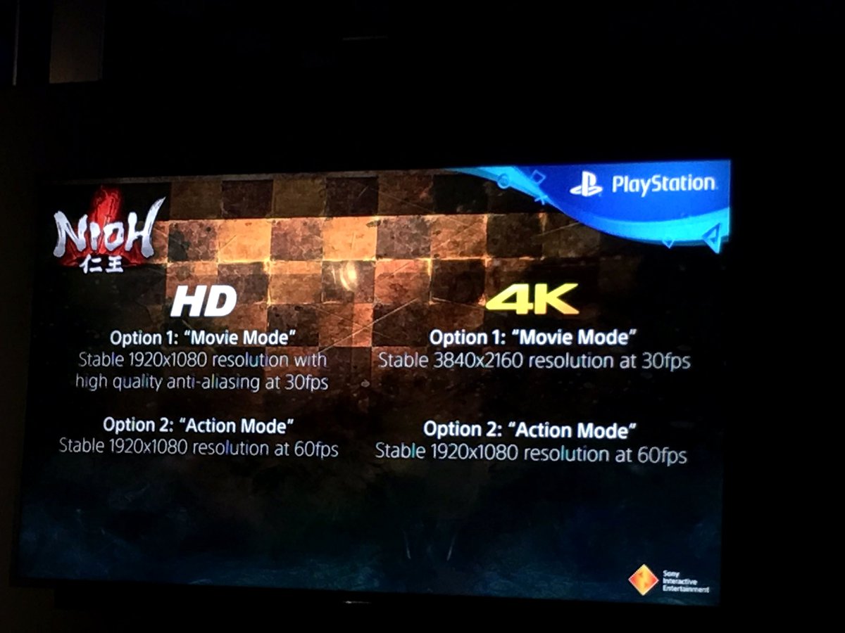 Судя по опубликованной в твиттере фотографии одного из слайдов презентации NiOh, версия игры для PlayStation 4 Pro получит два режима работы. Возможности режимов зависят от разрешения экрана, подключенного к PlayStation 4 Pro.