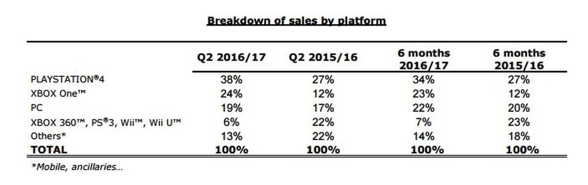 Основной платформой для Ubisoft остается PlayStation 4: в прошлом квартале на эту консоль пришлось 38% всех проданных игр компании. На втором месте идет Xbox One с 24%, PC с 19% продаж замыкает тройку лидирующих платформ. Цифровые продажи принесли компании €202.6 миллиона, или 72% от всех доходов за квартал (рост на 102.6%).