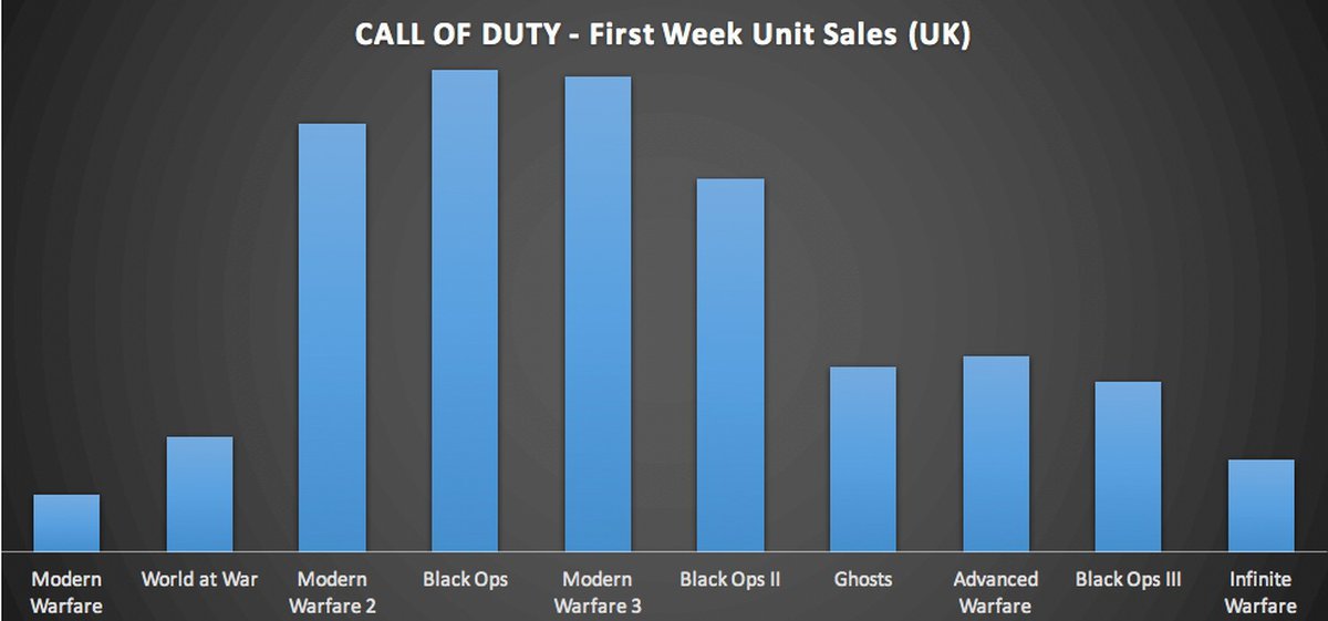 Уже слышали о низком уровне продаж Call of Duty: Infinite Warfare в Великобритании? Аналитик Niko Partners Даниэль Ахмад опубликовал в своем твиттере интереснейший график, наглядно демонстрирующий интерес британских игроков к серии Call of Duty.