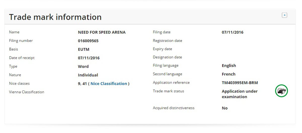 Заявка на регистрацию именно такой торговой марки, "Need for Speed Arena", была вчера подана в EUIPO (подразделение Европейского Союза, отвечающее за интеллектуальную собственность) от имени Electronic Arts. Компания хочет зарегистрировать торговую марку по классу видеоигр и развлекательных сервисов - в том числе и онлайн-игр.