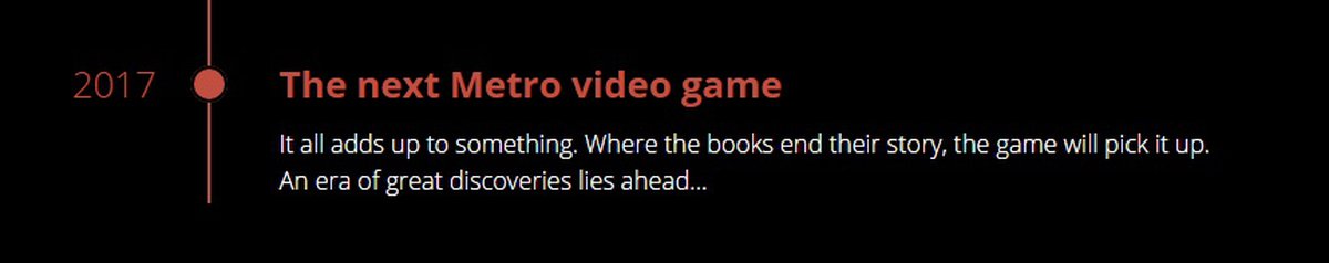Английский сайт книги Метро 2035 только что опубликовал предполагаемый год выхода следующей игры во вселенной Метро. Судя по таймлайну на сайте, продолжение Metro: Last Light должно выйти в 2017 году.