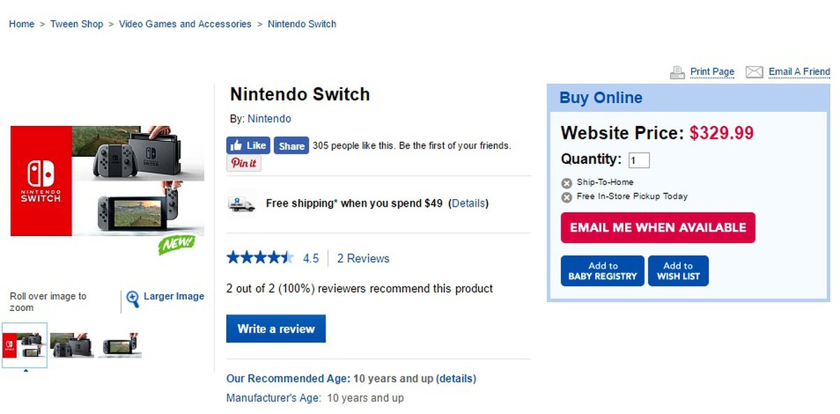 Возможно, это всего лишь ориентировочная цена (предзаказать консоль у Toys "R" Us пока нельзя, ритейлер ничем не рискует), однако выглядит она вполне достоверно. В конце октября несколько аналитиков высказались относительно возможной цены Nintendo Switch и сошлись на том, что консоль будет стоить меньше $300.