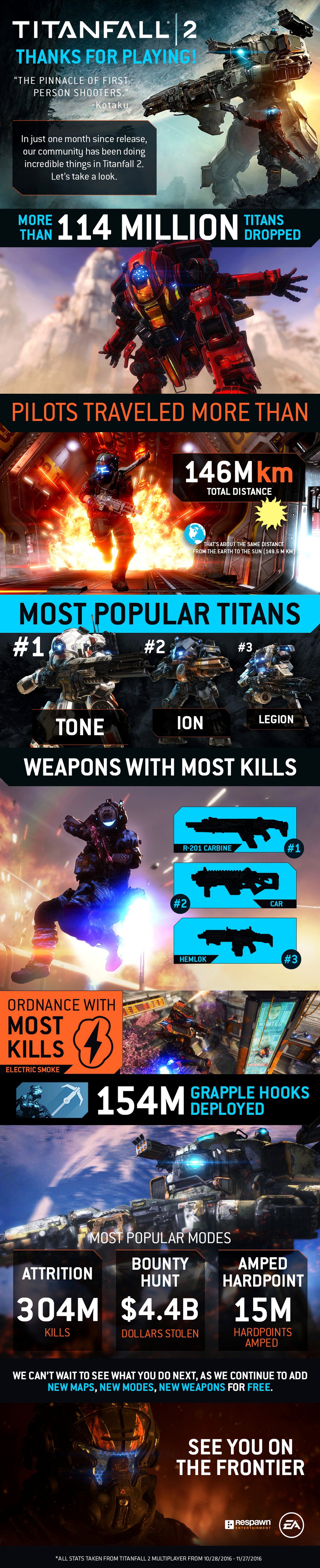 Команда Respawn Entertainment раскрыла некоторые цифры, описывающие общий игровой опыт в Titanfall 2. Разработчики опубликовали инфографику, назвав самых популярных титанов, самое смертельное оружие, количество высаженных на поле боя титанов, число пройденных пилотами километров - словом, куча цифр.