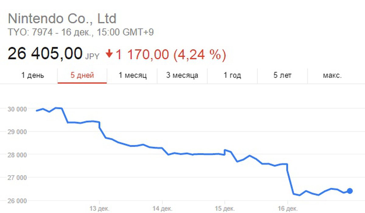 На данный момент стоимость акций японской компании продолжает снижаться; возможно даже, что скорость этого снижения усилилась. Например, только за сегодняшний день капитализация Nintendo упала на 4.24%, или около $1.5 миллиардов.