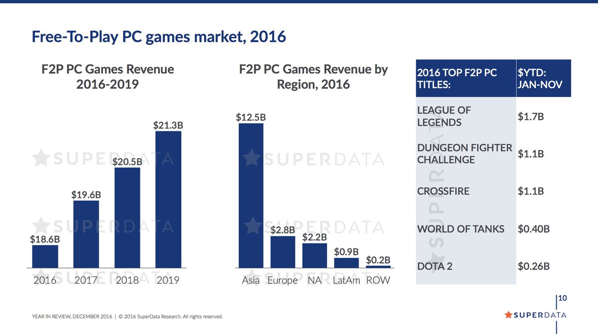Аналитики полагают, что в ближайшие годы выручка условно-бесплатных игр покажет устойчивый рост. В этом году условно-бесплатные игры для PC заработали $18.6 миллиарда, большая часть этих денег была заработана в Азии. Самой доходной условно-бесплатной игрой оказалась League of Legends: ей удалось заработать $1.7 миллиарда.