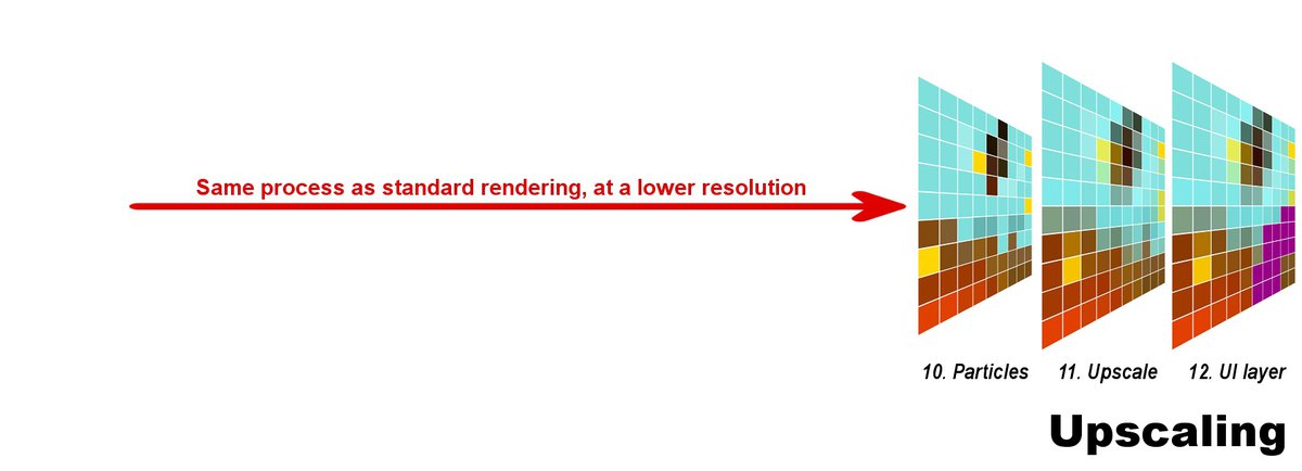 Обычный апскейл работает намного проще: все фазы до наложения интерфейса полностью аналогичны обычному рендерингу. Перед отрисовкой интерфейса к финальному кадру применяется один из алгоритмов ресэмплинга, а затем изображение показывается игроку.