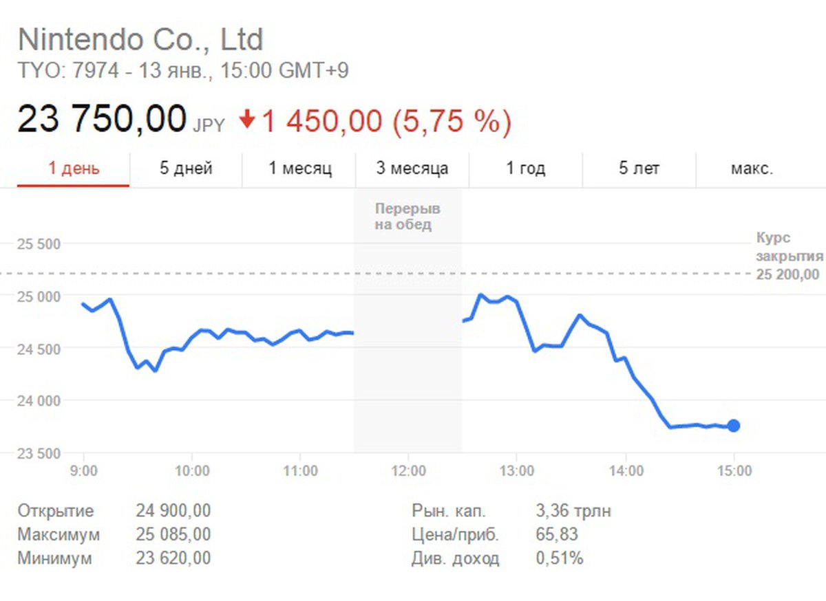 Кстати, у Nintendo. Трейдеры, кажется, не оценили всех прелестей Switch. Вскоре после презентации консоли стоимость акций Nintendo снизилась почти на 6%. В последний раз акции компании переживали такое сильное падение после выпуска Super Mario Run.