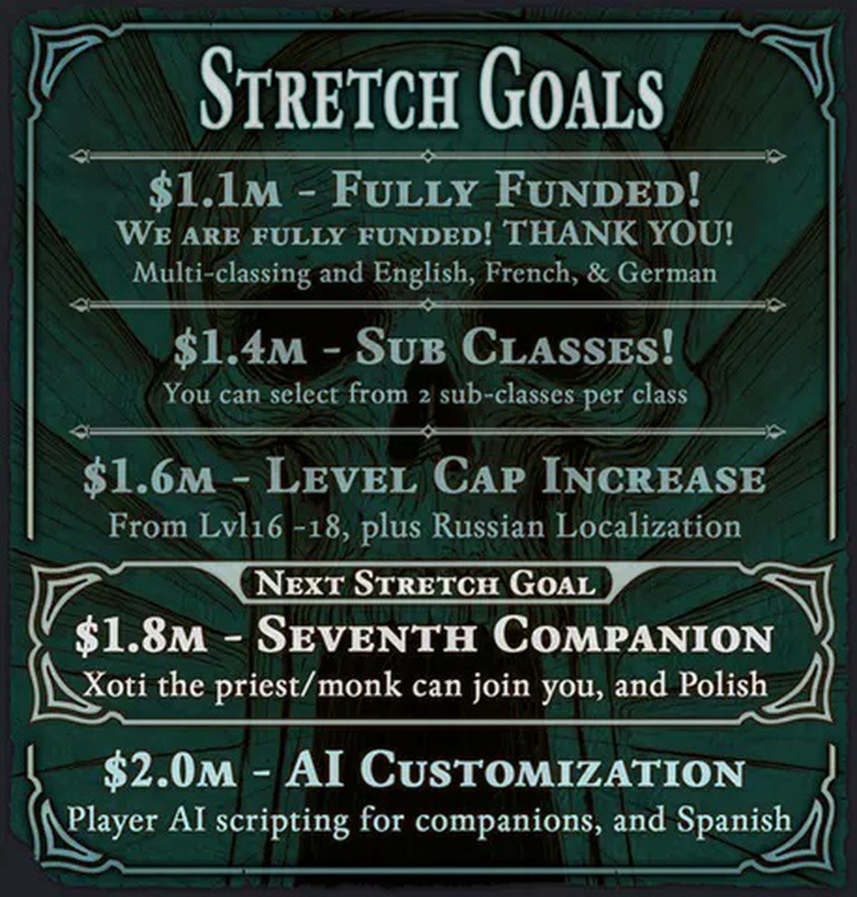 Если сумма привлеченных Pillars of Eternity 2: Deadfire средств превысит $2 миллиона, Obsidian Entertainment обещают добавить в игру испанскую локализацию (новая локализация будет появляться в каждой цели) и возможность программировать ИИ спутников.