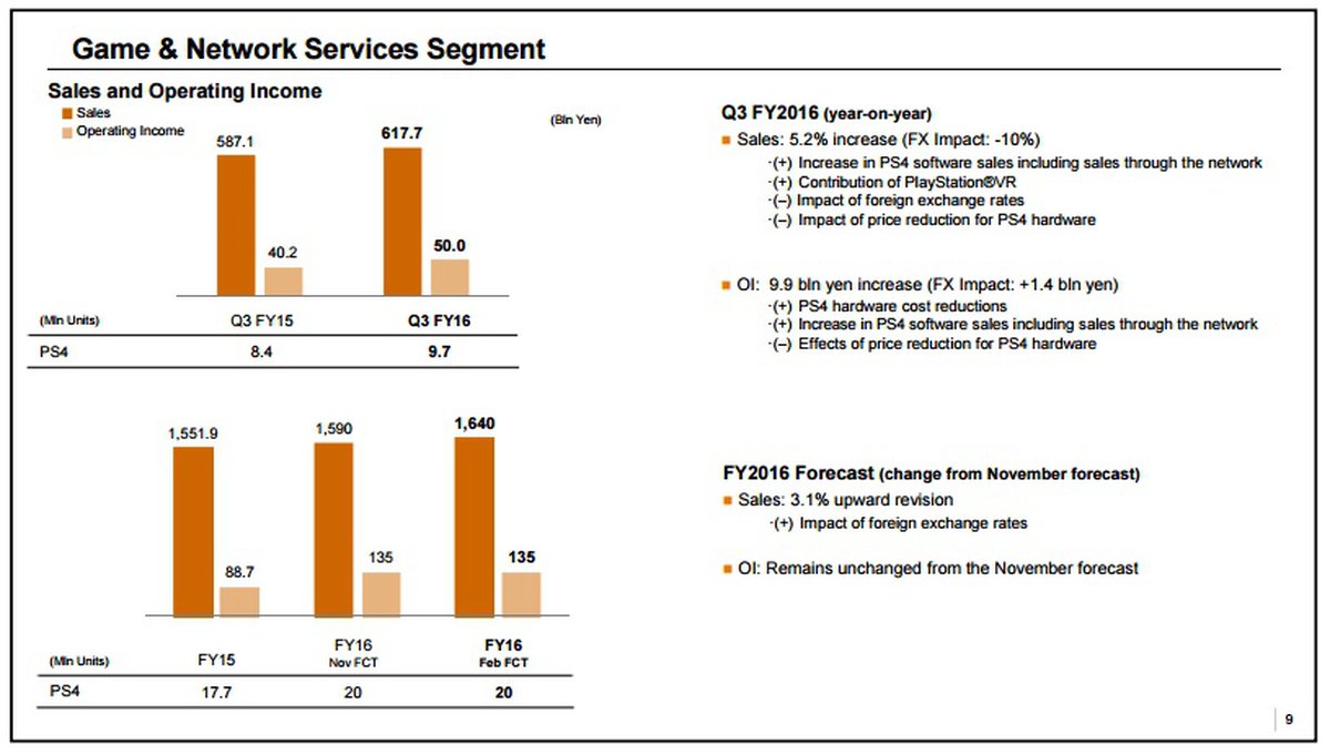 За весь 2016 финансовый год Sony планирует реализовать 20 миллионов консолей PlayStation 4, операционная прибыль игрового подразделения по итогам года должна составить около 135 миллиардов йен ($1.2 миллиарда).