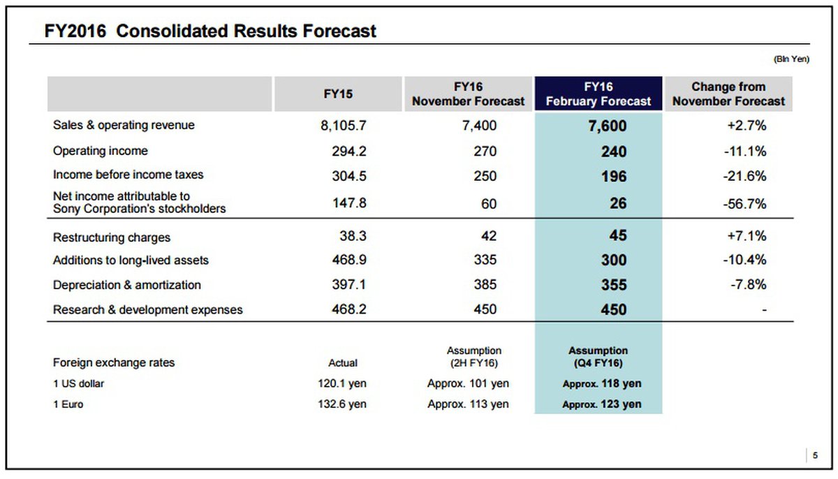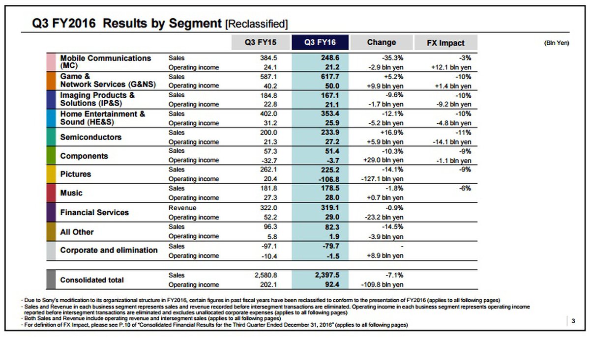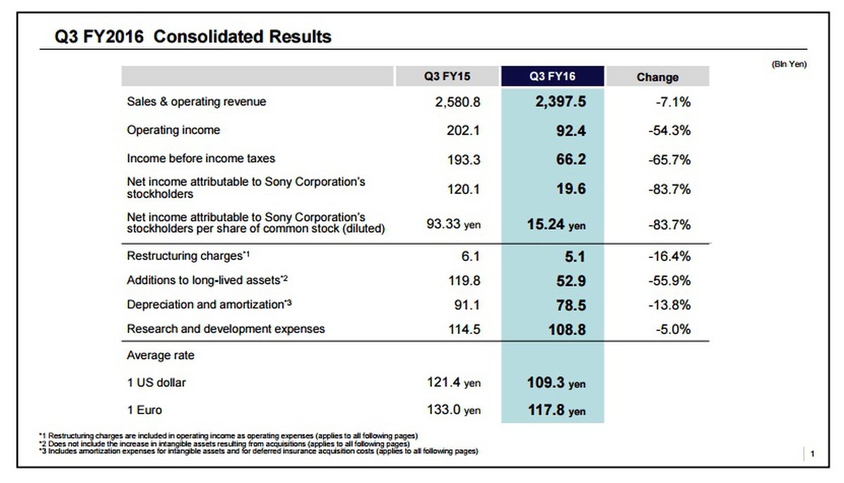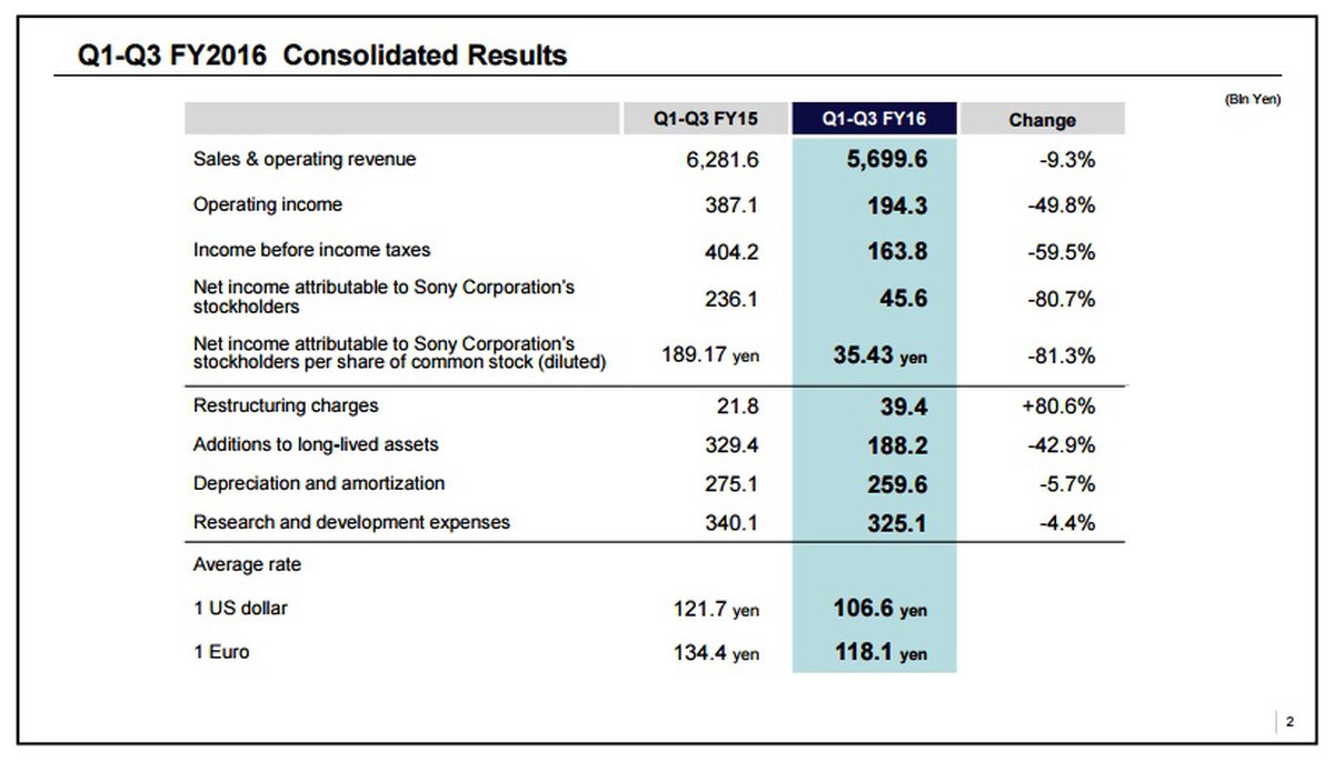 Общее падение продаж год к году составило 7.1%, операционная прибыль Sony уменьшилась на 54.3% - с 202 миллиардов йен ($1.77 миллиарда) до 92 миллиардов йен ($808 миллионов). За первые три квартала 2016 финансового года операционная прибыль компании составила 194 миллиарда йен ($1.7 миллиарда) по сравнению с 387 миллиардами йен ($3.4 миллиарда) в тот же период 2015 финансового года.