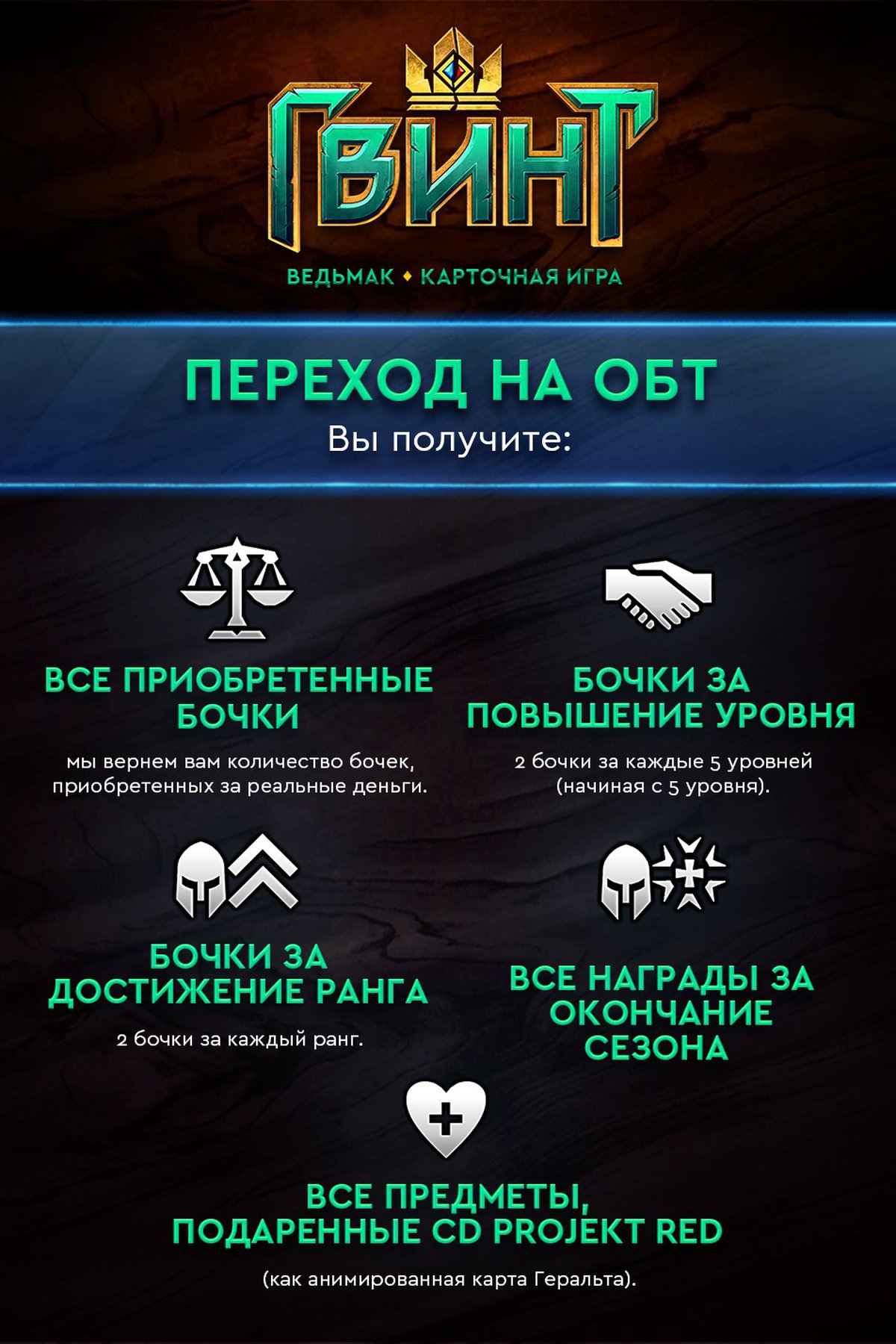 В начале открытого бета-теста Гвинта у всех уже зарегистрированных игроков будут обнулены уровни, коллекции карт и все добытые ресурсы. Разработчики обещают вернуть все бочки, купленные за реальные деньги.