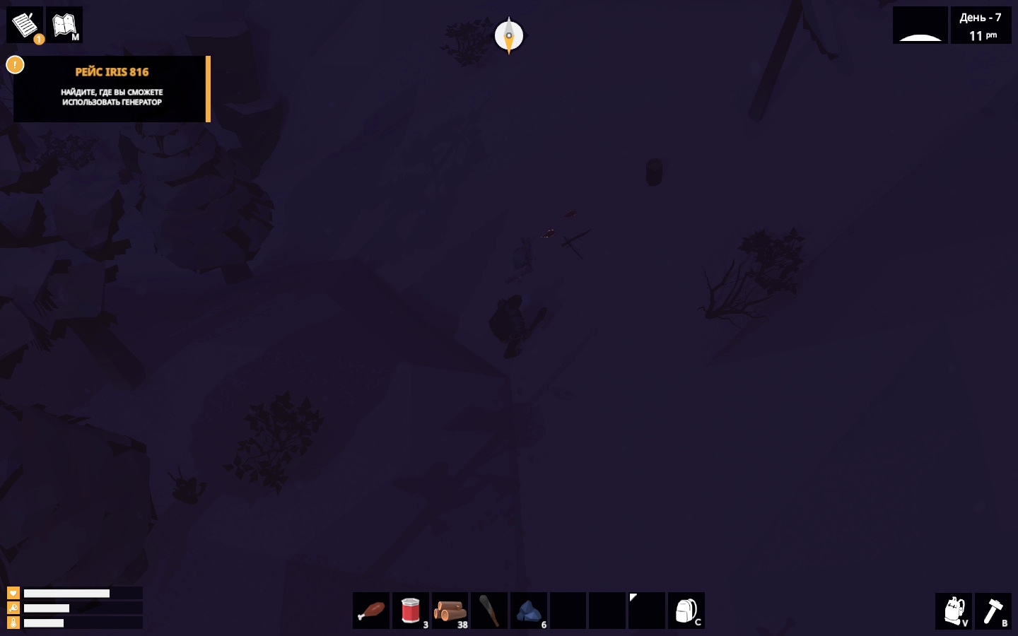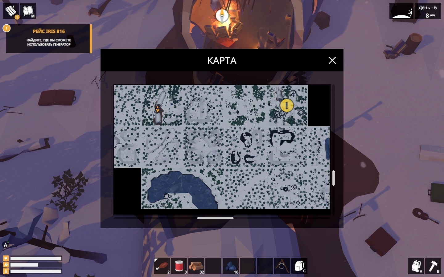 Хотя разработчики и говорят, что место спавна персонажей игра определяет рандомно, похоже, что в релизной версии это не так. Из раза в раз игрок начинает ровно в том же месте, где-то посреди карты. К слову, по субъективным ощущениям, карта мира очень даже большая. Увлечься разведкой местности и заблудиться где-то на её краю — абсолютная норма. Но заблудиться в прямом смысле не получится при всём желании: у персонажа есть компас, который указывает на цель задания, да и по самой карте ориентироваться очень просто. К тому же, как было сказано ранее, в The Wild Eight есть костры и таблички, предназначенные для ориентирования на местности.