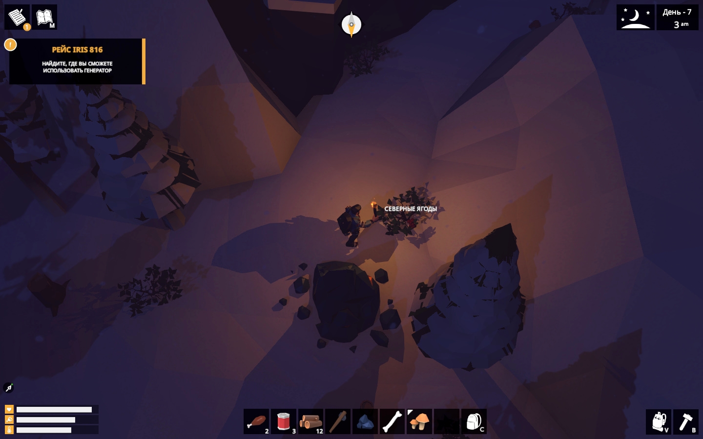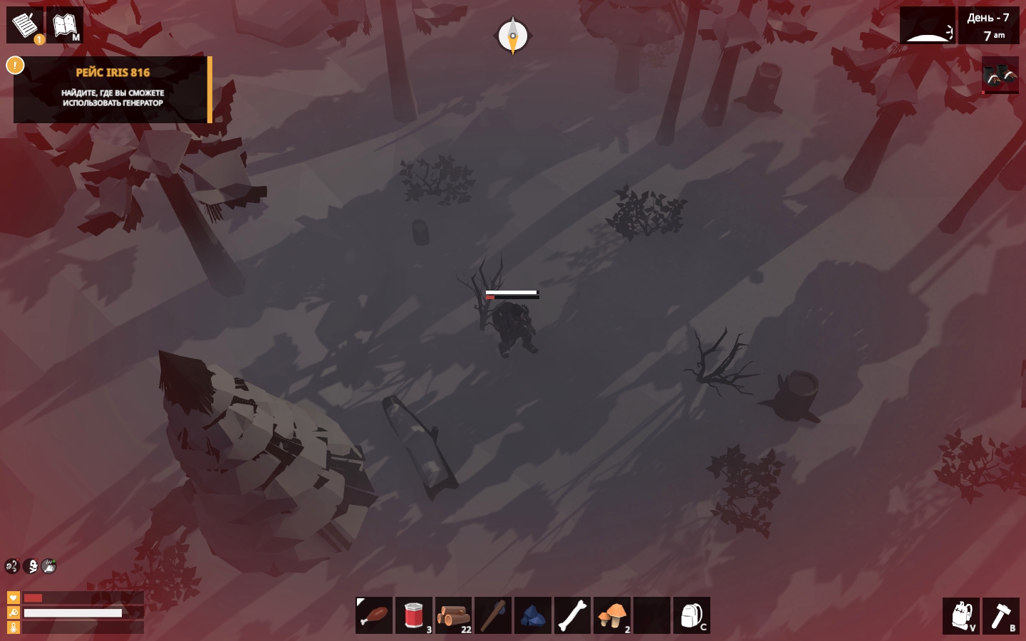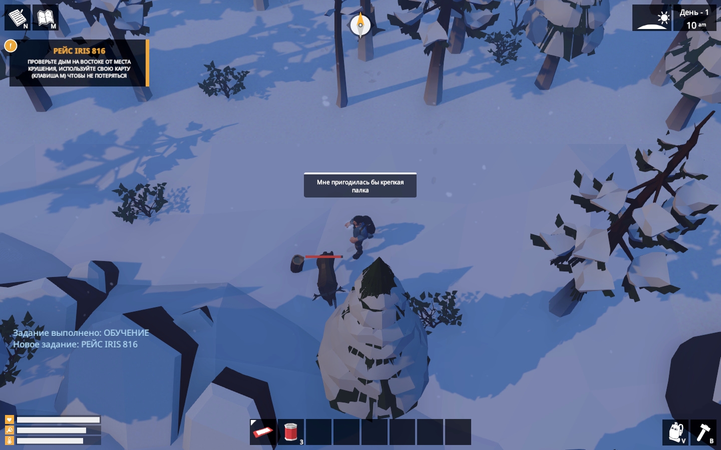 Единственное, что дарит светлую надежду на выживание – пара мясных консерв, напоминающие родную нам "тушёнку". Употребив одну такую, чувствуешь кратковременный прилив сил, но что-то начинает холодать, а значит, пора подумать о костре и месте для ночлега. Согрев руки у огня, играющего на останках самолета, задаёшься вопросом: с чего бы начать? Что нужно для жизни в таких условиях? Чем срубить дерево? Под рукой не оказывается ни одного вспомогательного инструмента; странно, ведь герой The Forest после аналогичной катастрофы был награждён пожарным топориком, а на этот раз его почему-то там не оказалось...