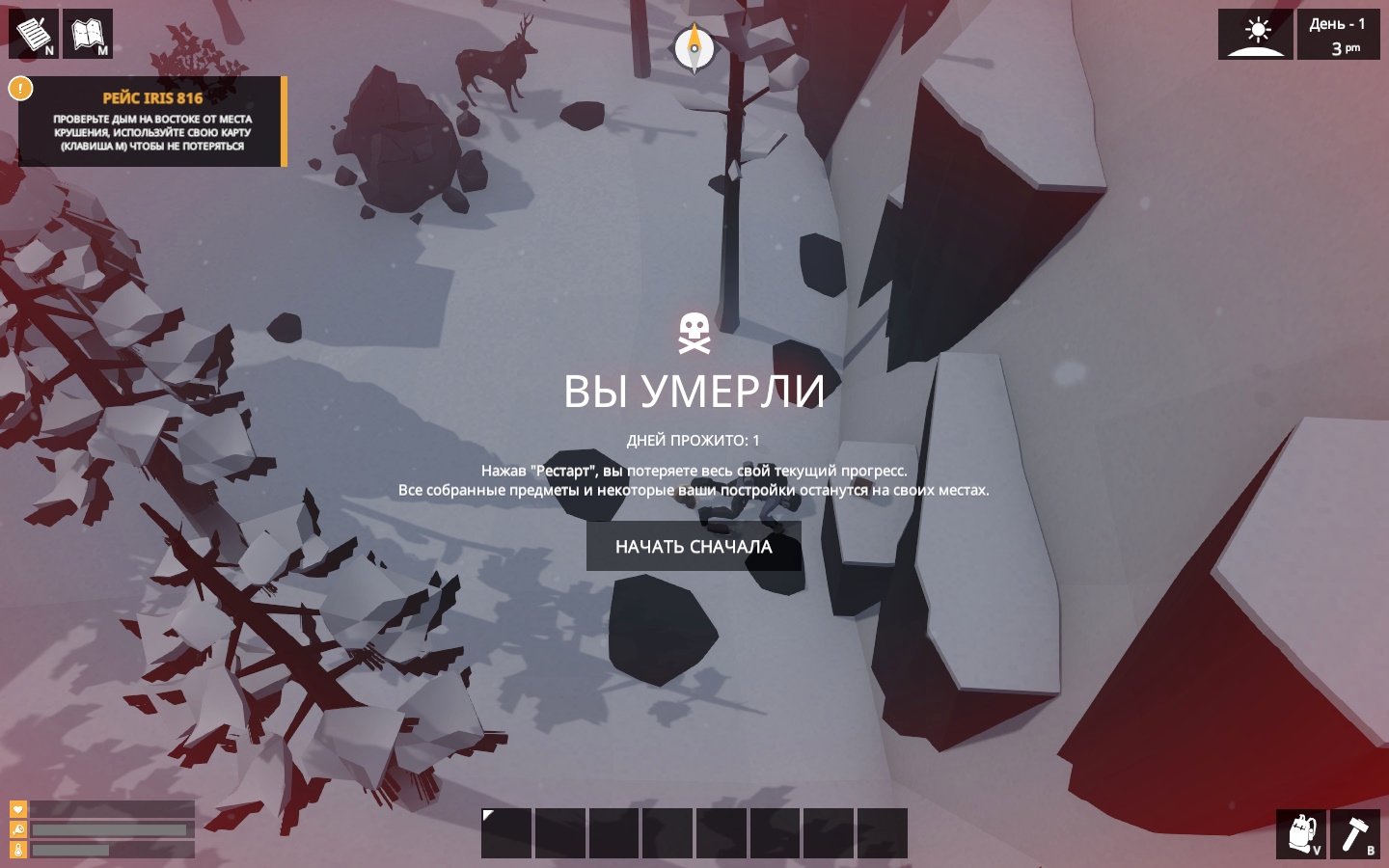 И это было всего лишь обучение, в течение которого игра более-менее дружелюбно научила тебя основам крафта и строительства, но не самому выживанию. Пережив одну ночь в уютной палатке, разведя костёр и обзаведясь начальным набором для жития-бытия, на ум приходит мысль в духе: "хм, а тут не так уж и плохо, пожалуй, я справлюсь". Будто бы почуяв позитивный настрой, игра коварно и хлестко бьет по лицу ровно в тот момент, когда ты выходишь за пределы лагеря. Вот и она — смерть.
