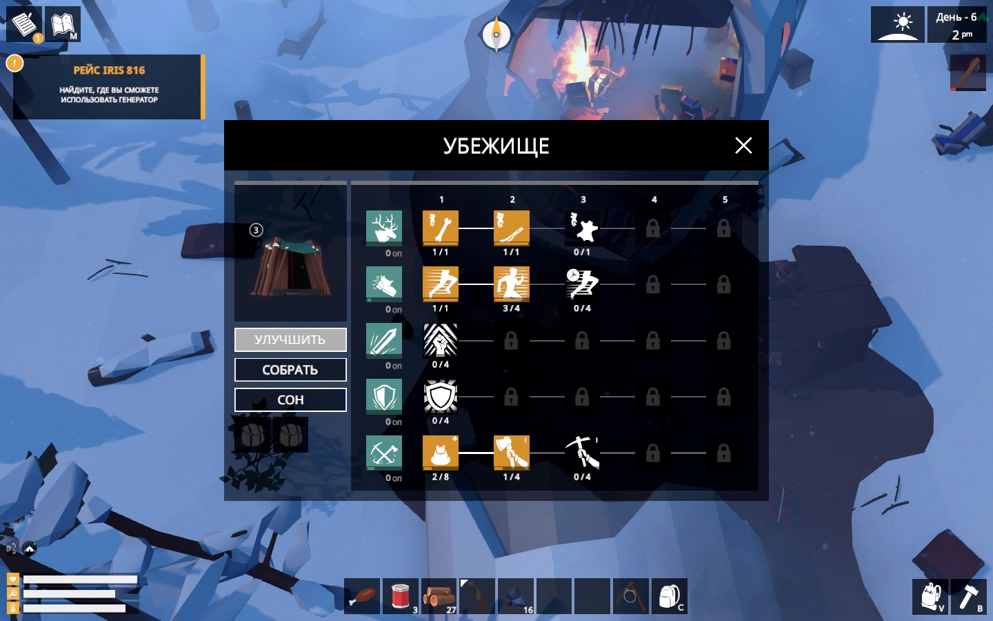 После очередной смерти персонаж снова просыпается у того же самолёта, с теми же консервами, но уже без найденного лута и прокачанных навыков. Стоит оговориться: лут и созданные ранее костры не пропадают, найденные в процессе игры вещи можно вернуть, собрав их с места последней гибели, а костры отмечены на карте. Подобно шахматисту, привыкаешь к необходимости продумать каждое своё действие на несколько шагов вперёд: там обитают волки, значит следует взять с собой оружие покруче топора; грибы и ягоды пускаю в ход, консервы нужно экономить; ага, у заброшенной вышки есть генератор, но это далеко, а значит, нужно взять факел и собрать палатку.