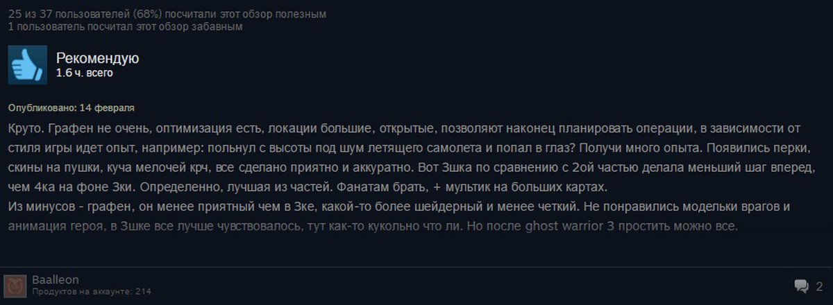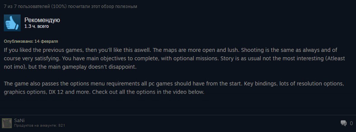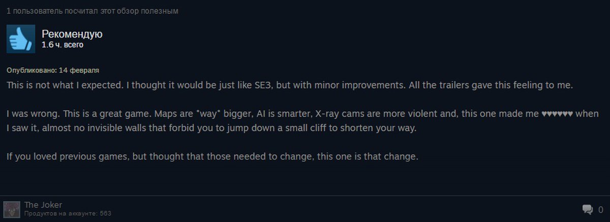 Вместо тысячи слов: "очень положительные отзывы". Обзоров пока немного, но они, действительно, исключительно положительные. Похоже, игра зайдет не только преданным фанатам серии Sniper Elite, но и фанатам стелса и незаметных прохождений в целом.