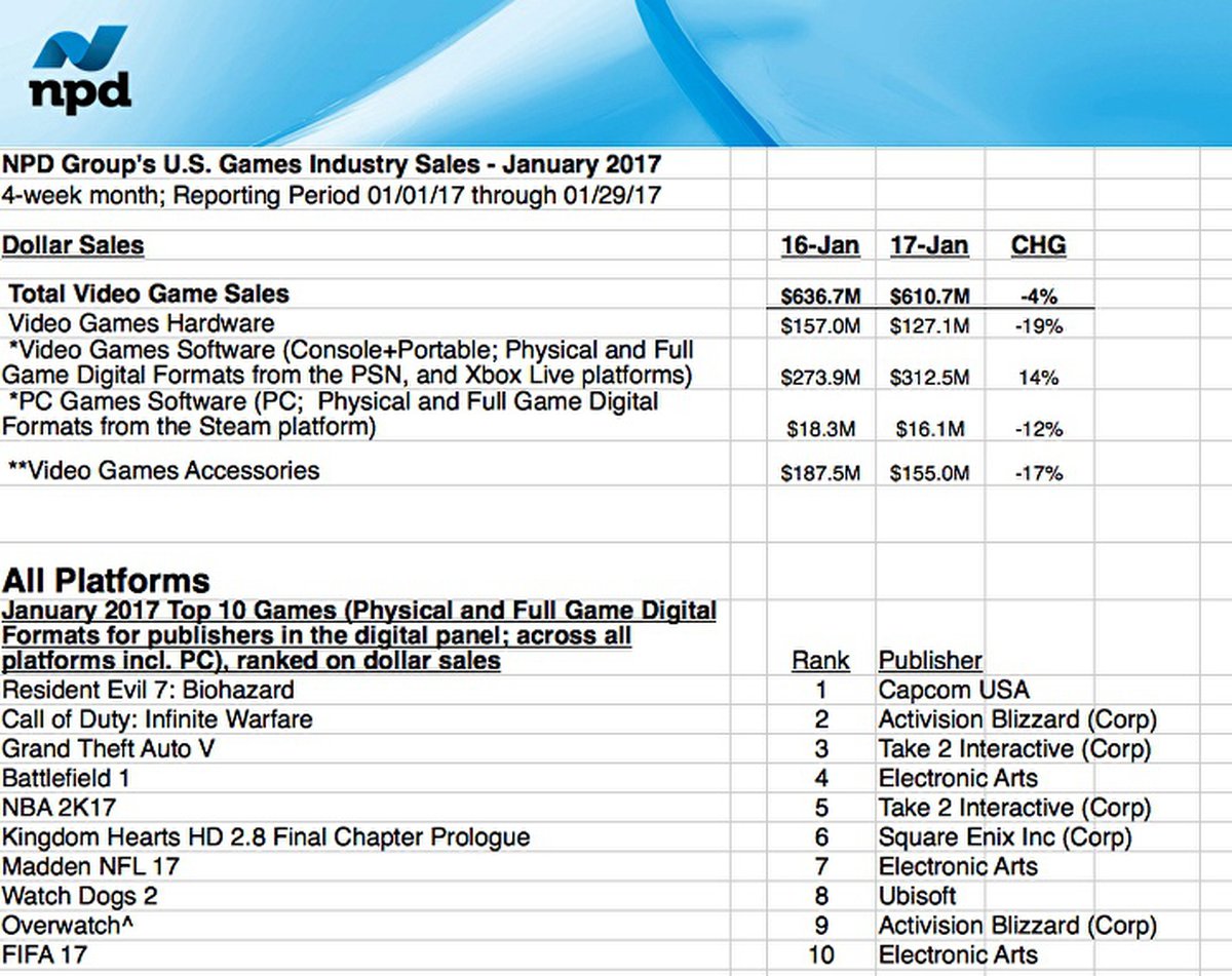 Продажи игровых устройств по сравнению с январем 2016 года упали на 19% и составили $127.1 миллиона, продажи игр для PC (учитываются продажи в Steam и продажи на физических носителях) по сравнению с тем же периодом прошлого года упали на 12% до $16.1 миллионов, продажи аксессуаров упали на 17% до $155 миллионов.
