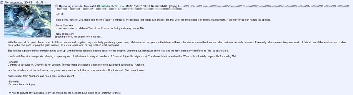 В списке было событие, приуроченное к Китайскому Новому Году - впоследствии оно действительно состоялось - и упоминалось, что Думфист не будет следующим героем. Несколько дней назад информацию о том, что следующим героем станет не Думфист, косвенно подтвердил Джефф Каплан, руководитель разработки Overwatch.