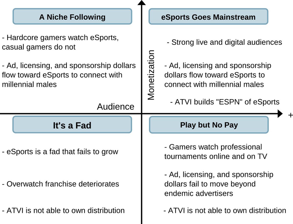 В этом случае киберспортивная лига Overwatch станет в один ряд с World Wrestling Entertainment и будет на 20% крупнее профессиональной футбольной лиги Major League Soccer. Впрочем, $720 миллионов это максимальная оценка - в Morgan Stanley рассчитали несколько возможных сценариев.