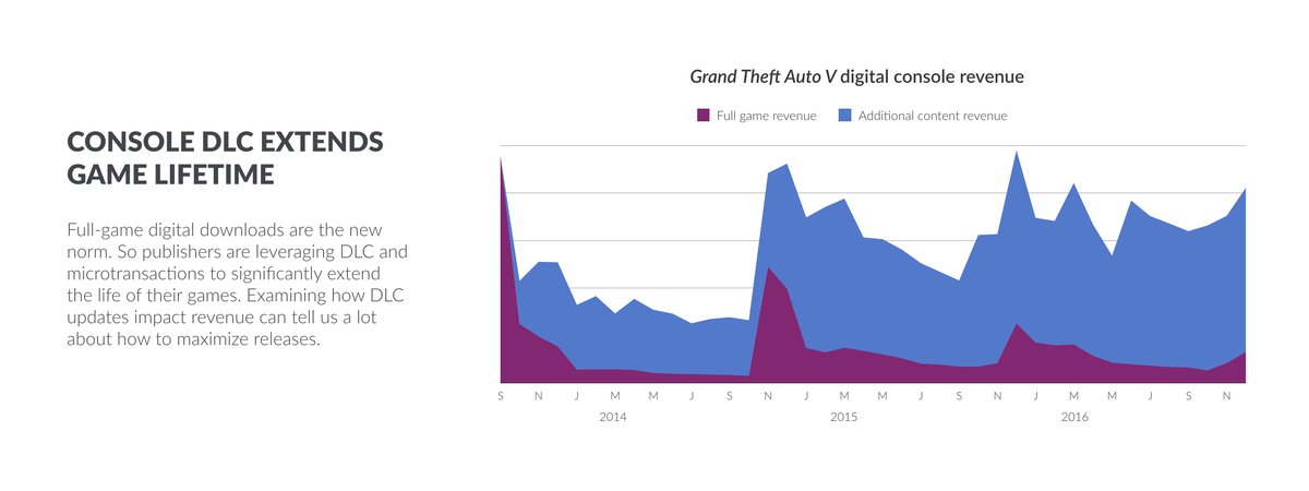 В короткой версии отчета, опубликованной на сайте SuperData, тоже есть несколько интересных моментов. Например, следующий график демонстрирует, какую именно выгоду получают создатели Grand Theft Auto V от выпуска платных дополнений и продажи различных внутриигровых предметов.