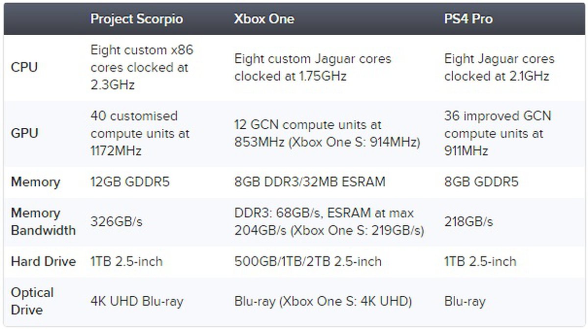Все верно: у Project Scorpio на 50% больше оперативной памяти, чем у Xbox One, PlayStation 4 и PlayStation 4 Pro, GPU новой консоли Microsoft оставляет позади и Xbox One, и PlayStation 4 Pro. Для сравнения характеристик консолей редакция Digital Foundry приводит вот такую удобную таблицу: