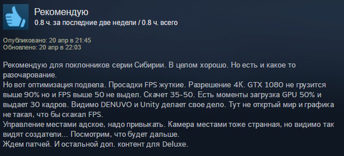 Если к преданным фанатам Syberia вы не относитесь то, возможно, стоит подождать выхода пары-другой патчей и дождаться скидки.