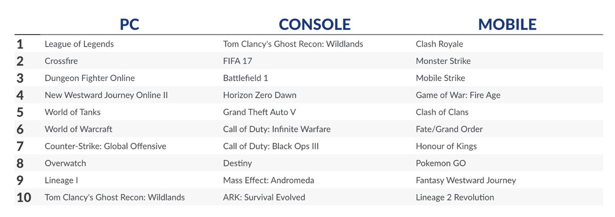 Как и в случае с недавним отчетом NPD Group о состоянии американского игрового рынка, первое место в консольном топе занимает Tom Clancy’s Ghost Recon: Wildlands. Примечательно, что в мартовской десятке самых прибыльных PC-игр нет DOTA 2 - в предыдущие месяцы игра стабильно появлялась на 8-10 местах топа.